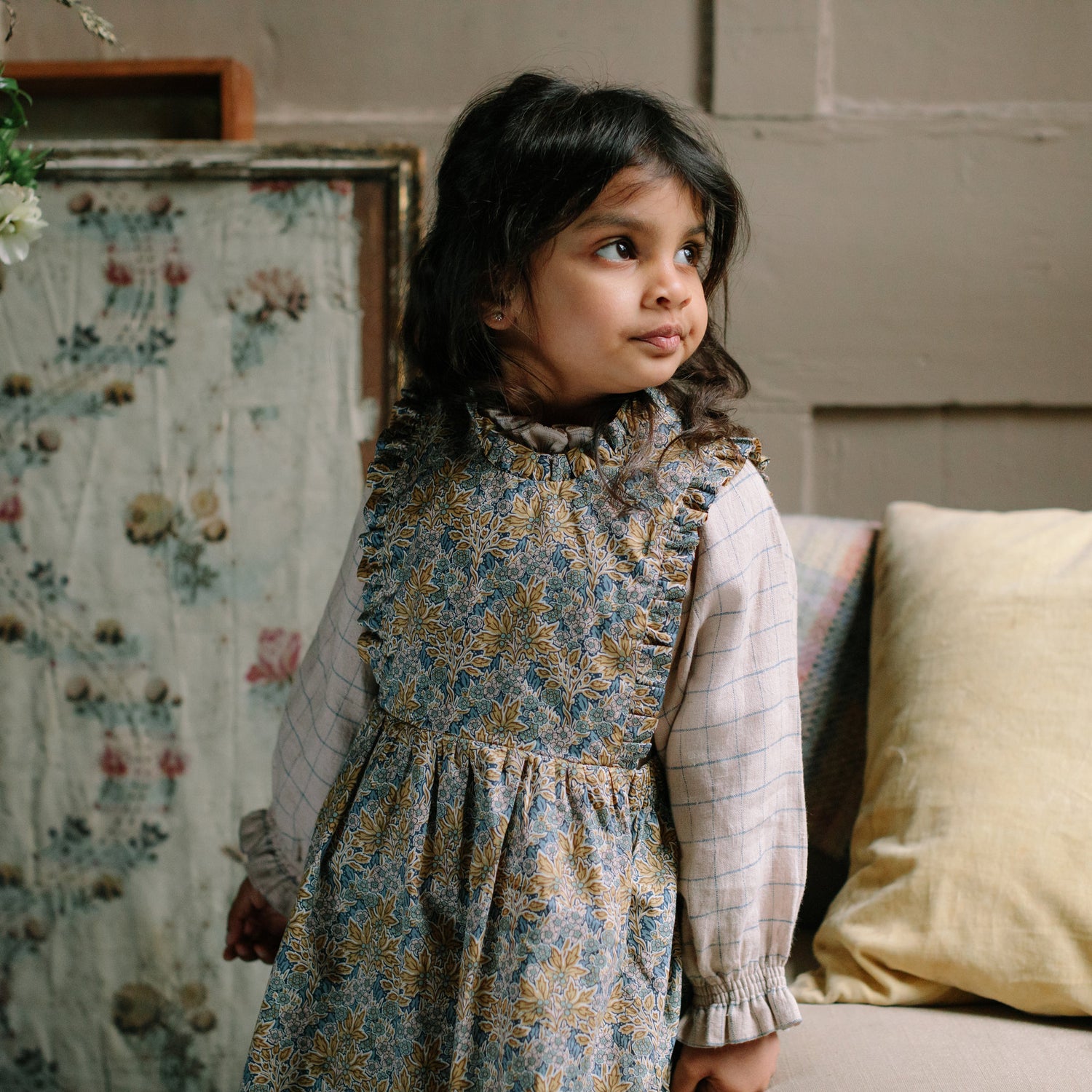 Simple pinafore shaped dress, with tabard style bib, finished with a sweet ruffle trim around the edge. Waist is elasticated and gathered at the skirt for a loose, comfortable fit. Top does up through single mother of pearl button on the back of the neck.